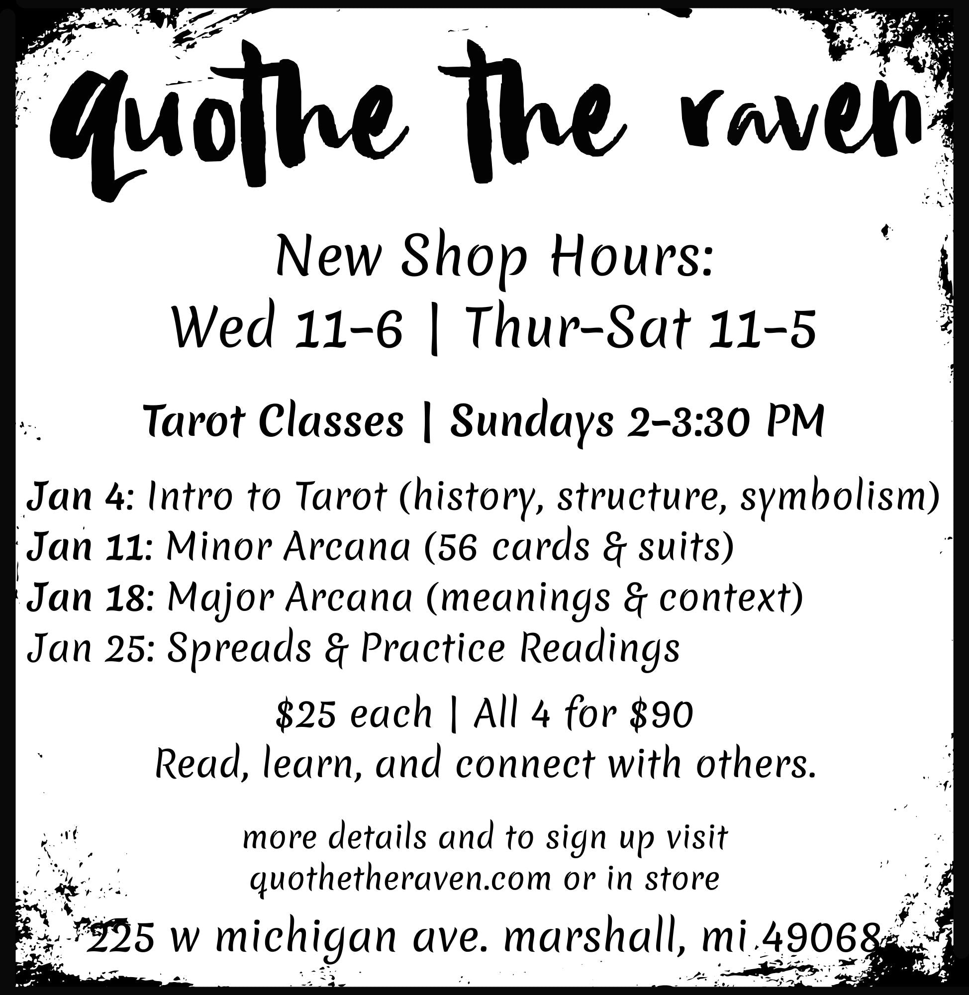 Quoth the Raven invites you to join a four-class Tarot Reading series led by local reader Grace Marengo. Designed for beginners and curious learners alike, this course offers a supportive, hands-on introduction to tarot, with an emphasis on learning together and building community through shared practice. Classes encourage discussion, connection, and confidence as you grow more comfortable with the cards.Students are encouraged to bring their own deck if they have one; extra decks will be available for use during class. Participants also receive 10% off the purchase of a new deck. A discounted rate is available when enrolling in the full four-class series. January 4th - Class I. An Introduction to Tarot• In this class, we will cover a brief history of tarot, learn about tarot deck structure, discuss the numerology and symbolism of all cards, and gain an understanding of the suits of tarot. January 11th - Class II. The Minor Arcana• In this class, we will cover the meanings of the 56 Minor Arcana Cards, as well as dive deeper into the significance of the four suits. January 18th - Class III. The Major Arcana• In this class, we will cover the meanings of the 22 Major Arcana Cards in depth, and begin to practice understanding the cards in different contexts. January 25th - Class IV. Spreads & Connections• In this class, we will cover some basic spreads and practice reading cards with our classmates!